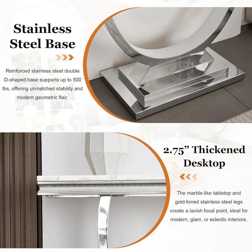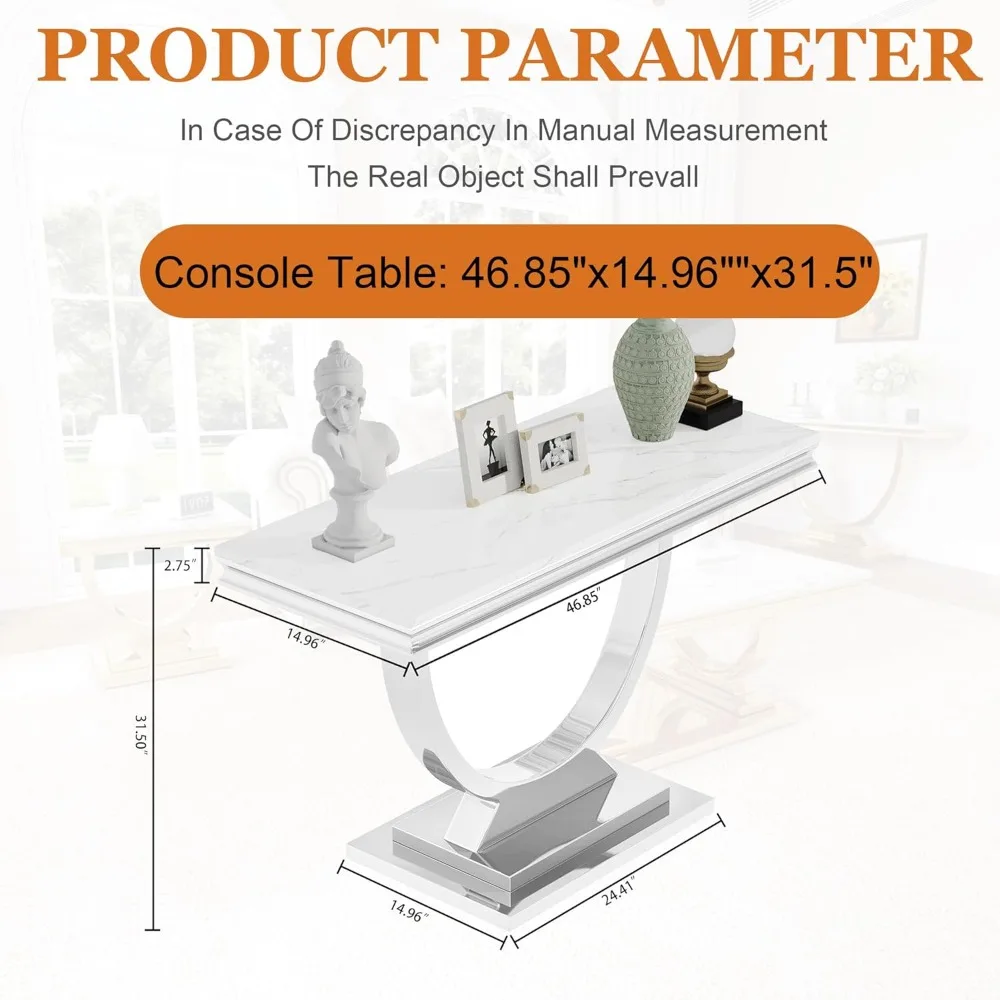 This item features an Elegant Marble Console Table that combines a white faux marble top with a U-shaped mirrored finish stainless steel base, offering a modern and glamorous look. The table's elegant design and appearance add a unique touch to any home decor. The table frame is crafted from 201 industrial stainless steel with an 8K mirror finish, ensuring a shiny and attractive presence in your living room. The high-quality stainless steel base, along with its U-shaped structure, provides enhanced stability and can support up to 500 pounds. The table boasts a luxurious 2.75-inch thick faux marble tabletop, which not only gives it an elegant and luxurious appearance but is also sturdy and durable for long-term use. The premium quality wood with imitation marble veneer is waterproof and anti-scratch, making it easy to clean and maintain with a damp cloth. This versatile living room console table can be used in various settings. It's perfect for serving as a focal point in gatherings or as a convenient surface for displaying magazines, books, or decorative items. The product dimensions are 46.8 inches in length, 24.4 inches in width, and 22.1 inches in height. The table's chic and stylish look, along with its simple structure, makes assembly easy. All labeled pieces and tools are included, and if you encounter any issues or have questions, customer support is available to help you find a solution promptly, typically within 24 hours.